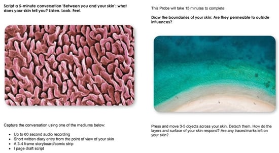 Each probe features a short creative task that invited participants to engage with and reflect on the skin alongside an evocative image (see Figure 2). The probes were designed to be provocative, playful, open-ended and ambiguous, and enjoyable to complete. Some probes included exploratory experiential tasks focused on doing and describing; these included instructions of how or what to touch, and invited participants to generate a critical reflective response. Probe 2, Hack a Skin Sensation, for example, invited participants to ‘Choose a daily routine when you touch your or another’s skin: human, animal, plant… Use/imagine using an unexpected object(s) to ‘hack’ a skin sensation; and use micro gestures to act out this ‘hack’. Other probes consisted of questions to respond to, for example, Probe 6, Boundaries, asked participants to ‘Draw the boundaries of your skin: Are they permeable to outside influences?’ Others suggested tactile sensations to experience, or concepts or images to respond to. Probe 4, Living Skin, for example, included an image of the skin and invited participants to ‘Script a 5-min conversation ‘Between you and your skin’: what does your skin tell you? Listen. Look. Feel.’ The format of the probe responses varied with optional forms including short videos, written notes, narratives, audio notes, sketches or photographs. These formats also drew on the participants’ preferred or specialist practices identified during phase 1 (e.g., enacting micro gestures and sketching).
