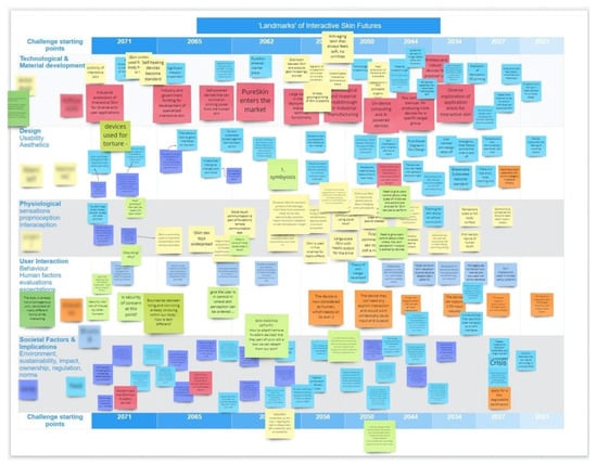 The workshop Miro boards were transcribed and collated to produce a series of bullet points for each time period. That was shared with the lab leader to review, comment on and rank (high–medium–low) in relation to their significance for the future of interactive skin. This underpins the development of a speculative narrative on interactive skin aimed at supporting reflection and questioning, and disrupting and extending the work engineers, designers and researchers working with interactive skin (Jewitt, Barker and Steimle, forthcoming). The narrative brings the five starting points of the workshop mapping exercise (i.e., the technological, material, design, physiological, user interaction behaviour, sensory and societal) into a 50-year temporal framing and puts them into synergetic conversation to expose the tensions and connections involved in the future of this emergent technology.