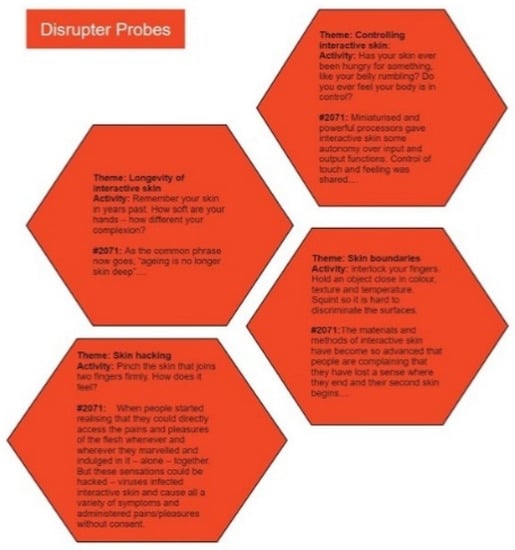 The design space opened by emergent multimodal technologies, such as interactive skin, unsettles the boundary/interface between the human body and computing. Such uncertain spaces drive calls for ‘lively’ social research methods orientated to the unfolding ‘becoming’ of the social world [,] and have heralded many methodological turns. There have been turns to the multimodal [], multisensory [,], ‘non-representational’ [] and ‘more-than-representational’ approaches [] and ‘messing methods’ []. These turns signal a dissatisfaction with the limits of social research methods [] and seek, albeit in different ways, to engage with the complexity of lived experiences beyond language. This has intensified social researchers’ interest in mobilising creative and imaginative methods to disrupt social research practices [,]. The approach discussed in this paper draws on two creative approaches—online probes and a speculative approach, both of which have been used in social research on ‘emerging and uncertain’ digital futures [,].