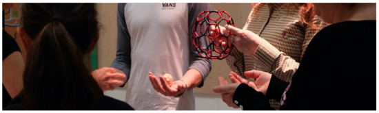 Different states of presence and materiality were journeyed through by participants in TFS workshops across a sequence of tasks. The participants sensed and moved ball-like objects/entities as physical, virtual, and imagined ‘states’ across six ‘sensing stages’: (1) physical; (2) imagined; (3) sounded–virtual; (4) visual–virtual; (5) visual and sounded virtual; and (6) (re-)imagined (see Figure 3, Figure 4, Figure 5 and Figure 6).