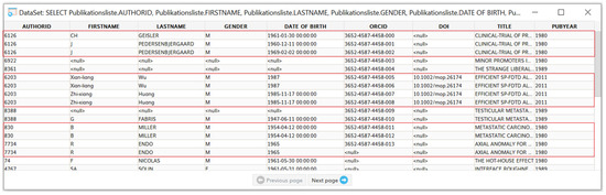 Figure 1 shows an example of duplicate records for a database of publications (retrieved from Web of Science), which we will later use for demonstration purposes, which collects data on the article, i.e., its title, DOI, year of publication, as well as the data on its author—ID, first name, last name, gender, birth date and ORCID. This database contains three sets of duplicates, as shown in the red boxes in Figure 1, which remained unnoticed in the past since duplicate checks were not conducted. More precisely, due to duplicate records, 3 publications appeared in 11 entries and are counted as 11 publications, contradicting the state of the actual publications.