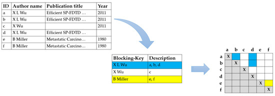Figure 3 shows an example of a standard blocking procedure demonstrated in a simple example, in which we dealt with a table containing data about the author, the title of the publication and the year of its publishing, where a unique identifier ID was assigned to each record. With standard blocking, each description is assigned to exactly one block based on its blocking key.