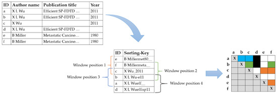 Figure 4 shows an example where the sort-key is formed by the three-character prefixes of the author’s name, publication title and publication year attributes. The window size is w = 3. The window is pushed over the sorted keys. All pairs of entity descriptions whose keys fall into the common position of the sliding window form the so-called candidate pairs. The elements e, f, and c form a block for the first position of the sliding window. f, c, and b fall into one block for the second position of the window.