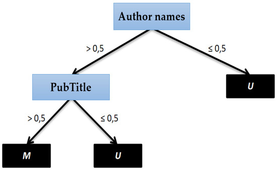 In addition, this rule may depend heavily on the expert′s knowledge of the quality of the database. It is therefore conceivable that a general statement can be made on which attributes have a higher value, a higher discriminant for the duplicate detection. However, in the knowledge-based rules, it is crucial that the relevant domain knowledge is expressed by combining the limit values and attributes used in the rules. Finally, either the final limit value is used to decide whether a pair of tuples are assigned M or U, or a matching type is assigned directly by a rule [31]. Figure 6 shows matching type varies, depending on the case, either M or U.