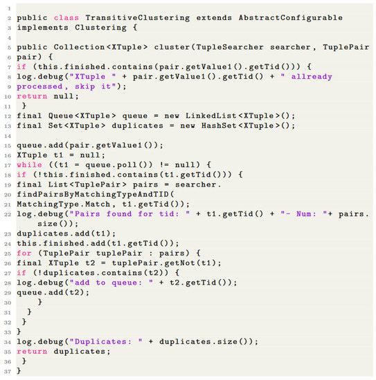 Step 5 Cluster the duplicates: In most use cases, finding duplicate pairs is not enough. The goal is to find all the tuples that represent real-world objects. Thus, the duplicates found must be combined into clusters. This clustering is usually implemented using certain forms of transitivity. A very simple way is to create a transit envelope over duplicates [2]. Finally, recognised clusters are properly merged/fused or the decision on the remaining tuples and those to be deleted are made. In Figure 7, we provide the code that we used to group duplicates by means of a transitory envelope.
