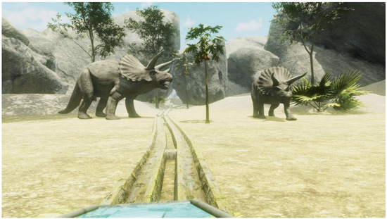 Participants signed the informed consent and completed the Simulator Sickness Questionnaire (SSQ) before the beginning of the experiment (baseline SSQ). The experiment was described as an investigation into users’ experience during a virtual roller-coaster simulation. Then, participants were fitted with the HMD, the Oculus Go, which has a single screen with a resolution of 2560 × 1440 running at 60 Hz. The software used for the VE simulation was “Epic Roller Coaster” by B4T Games using the T-Rex Kingdom environment (version as of 1 June 2020; see Figure 1). A roller-coaster environment was chosen, which is in line with the goal of examining the association of CS and sense of presence, because of a roller coaster’s intrinsic ability to induce sickness.