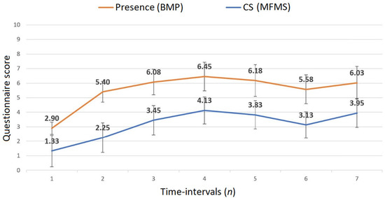 Mean scores for sense of presence and CS across seven time-intervals. The orange line represents MFMS scores, and the blue line represents MFMS scores. Black error bars represent standard deviations.