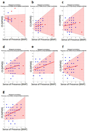 Skipped correlations between MFMS and BMP for each measure in time. Skipped Pearson’s correlations for each measure of MFMS and BMP. The top of the figure shows Pearson’s r coefficients and 95% confidence intervals (shown as the transparent red area in the figure). The numbering above each skipped correlation indicates the time interval. The x-axis represents the score for sense of presence (BMP; 1–10), and the y-axis shows the score for CS (MFMS; 1–10). Dots show each data point, where red dots represent outliers that were eliminated before the correlation analyses were computed. (a–g) represent the chronological order in which the questionnaire answers were collected during and after the VR experience.