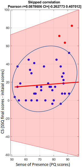 Pearson’s correlation analyses were performed to assess the relationship between sense of presence and CS at each measured time-point. Due to the relatively small sample size, and to reduce the effect of univariate and bivariate outliers affecting the results, correlations were performed using the robust correlation algorithm (skipped correlation method) [55]. Such an analysis method was used for estimating linear correlation first for individuate univariate and bivariate outliers using the mathematical method described in Wilcox [56], and then performing Pearson’s correlation analyses returning 95% CIs to estimate statistical significance.