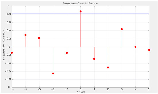 Cross-correlations between MFMS and time-shifted values of BMP. Horizontal blue lines display the upper and lower confidence bounds. The X-axis shows time-shifted values of sense of presence on the effect of CS. Y-axis indicates sample cross-correlation values.