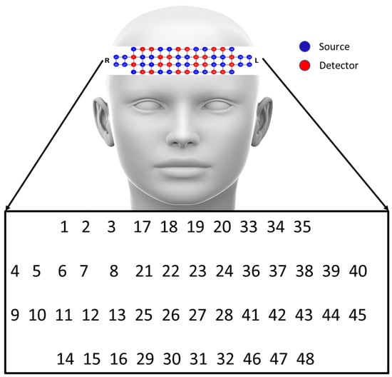 NIRSIT has a total of 24 laser diode sources and 32 detectors. The relative changes in hemoglobin concentration are measured by using light attenuation of two different wavelengths: 780 and 850 nm. There are 48 primary channels in this device of which 16 are located on the right, 16 in the center and 16 on the left of the pre-frontal cortex. In addition, the device also considers the horizontal, vertical and diagonal connections between channels. Four different distances (15, 21.2, 30 and 33.5 mm) between channels are considered by the device. This results in a total of 204 channels. FNIRS data using this device are collected at the sampling rate of 8.138 Hz. The channel locations are shown in Figure 2.