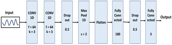 The 1D-CNN model in the first stage was created as follows. It has two convolutional layers, one max pooling layer, one fully connected dense layer, two dropout layers and a softmax classifier. In both convolutional and dense layers, a rectified linear unit (ReLU) was used as an activation function. The dropout layers were used after the convolutional layers and the dense layer to perform better regularisation. Mean squared error was used as the loss function. For the optimisation algorithm, we used stochastic gradient descent (SGD), with a momentum of 0.9 and a decaying learning rate, with an initial learning rate of 0.01, and a mini batch size of 64. The epoch number was set to 200. The schematic diagram of the 1D CNN model is shown in Figure 4.