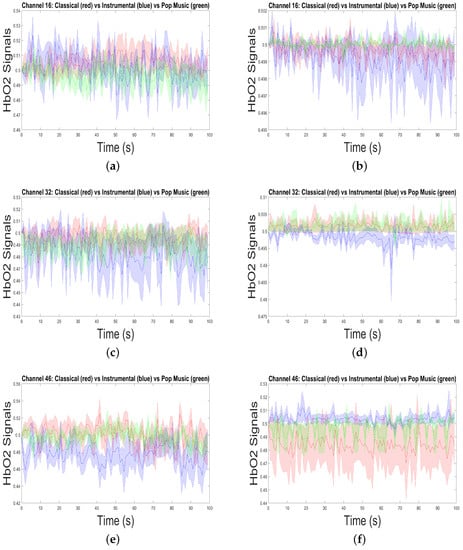 We further conducted a visual analysis of the HbO2 signals to understand how well the signals can differentiate the three music genres. We performed a timeline analysis of 100 s of signals recorded in two different stages of the experiment. The first stage signals were taken from point 900 to 1000 starting from the beginning of one genre, which is approximately 100 s after the start of the genre. The second stage was from point 2500 to 2600, which is approximately 300 s into listening to one genre. The analysis was performed on the average of all participants pre-processed HbO2 signals from three different channels. We picked channel no. 16, 32 and 46 from the left, mid and right side of the pre-frontal cortex, respectively. These channels were chosen based on their good quality of data. The signals were reshaped to set the initial value to 0.5. This value was chosen so that the increasing or decreasing trend of fNIRS response could be seen in a clear manner. The result of the timeline analysis is shown in Figure 6. The red shaded area shows participants’ fNIRS responses to classical music, while the blue and green shaded areas show responses to instrumental and pop music, respectively.