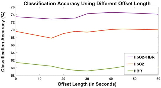 We further trained the 1D CNN model without the data from the first music track of every genre. This resulted in an increase in the classification accuracy to 75.7% using both HbO2 and HbR signals, 73.1% accuracy using only HbO2 signals, and 63.9% accuracy using only HbR signals. This could be due to the fact that fNIRS is a slow modality signal, so the effects of listening to a specific genre require time to be reflected in the signals recorded. Since the effect is seen in a delayed manner, we assumed that the effect of listening to one genre may be reflected after the playback was finished for one genre. Therefore, we further trained the model using varied offset lengths of the final stimuli in every genre. The classification result in differentiating three genres is shown in Figure 7.