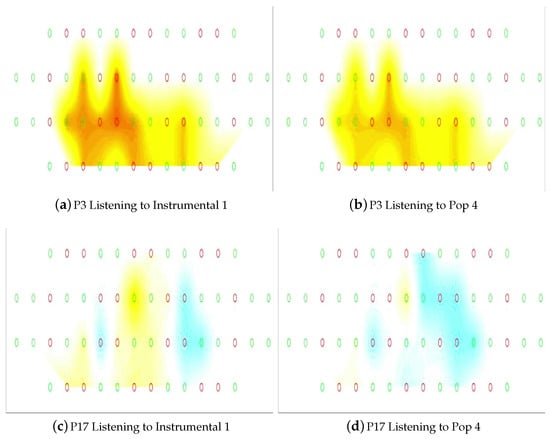 Sample Activation Map Frames: (a,b) = Frame 417 of P3 Listening to Instrumental 1 and Pop 4; (c,d) = Frame 417 of P17 Listening to Instrumental 1 and Pop 4.