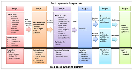 In STEP 1, we wish to acquire documentation in the form of digital assets that are relevant to the representation of a craft. Based on these assets, knowledge about a craft will be formed (STEP 2). This knowledge is to be semantically represented, availing a digitally preservable representation of a craft (STEP 3). This representation will provide the foundation for curating narratives (STEP 4), which are to shape the presented content. This content is to take the forms of informational tools, multimodal presentations, and experiences (STEP 5), which will be used for HC preservation, Tourism, and Education (STEP 6). Figure 1 is divided into two sections. The top section presents the aforementioned steps, while the bottom section presents the provisions offered by this work through the web-based authoring platform. Thus, in each step, the tools provided by the platform for facilitating the curation tasks involved are shown.