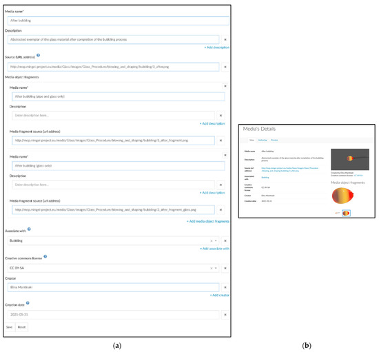 As the first activity of this step, the assets uniquely identified in the Mingei namespace are transformed into media objects using the data curation facilities of the authoring platform. Media objects are classified into seven categories: images, videos, audio, MoCap, 3D reconstructions, 3D objects, and motion vocabulary. Each media object has a name, a description, an image, a source file IRI, and one or multiple media object Fragments. Media object fragments are continuous subsets of media objects, e.g., a snippet of text, audio or video, an image region, etc. (see Figure 2b). An example of curating and previewing a media object is presented in Figure 2.
