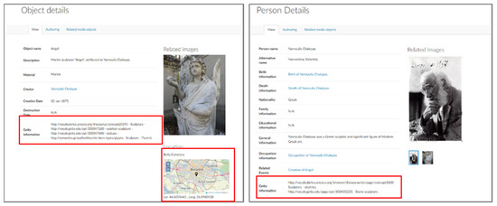 The authoring platform supports the use of multiple controlled vocabularies and provides them along with the remainder of the semantic annotations already provided. The example below (see Figure 4) demonstrates our record of an article about Tinian Marbleship, a burial memorial at the cemetery of Bellu, Bucharest, Romania. The record is annotated with links to the vocabularies of UNESCO, Getty, and the Greek National Aggregator. In addition, the location is visualized directly on the bottom right of this screenshot. The artist’s record is shown on the right, where he is also annotated with his occupation as a stone sculptor.