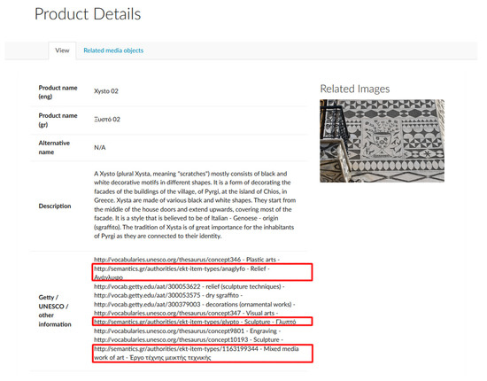 The next example illustrates a case where the linkage to the vocabulary of a national aggregator is important. The example regards a “xysto” (plural “xysta”), which relates to a specific craft of building façade decoration met only at the Pyrgi, on the island of Chios, in Greece (see Figure 5). It is a style that is believed to be influenced by the Italian–Genoese–origin (sgraffito), which occupied the island during the 15th and 16th centuries but has developed an individual style at the particular location over time. The tradition of Xysta is of great importance for the inhabitants of Pyrgi as they are connected to their identity. In this case, the national (Greek) dictionary is more specific and, thus, the knowledge element contains both links to the UNESCO and Getty thesauri (as ‘sgraffito’), as well as to the national dictionary (as ‘xysto’).