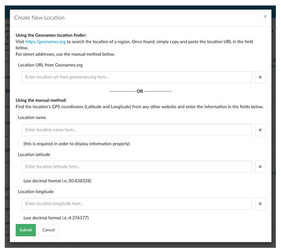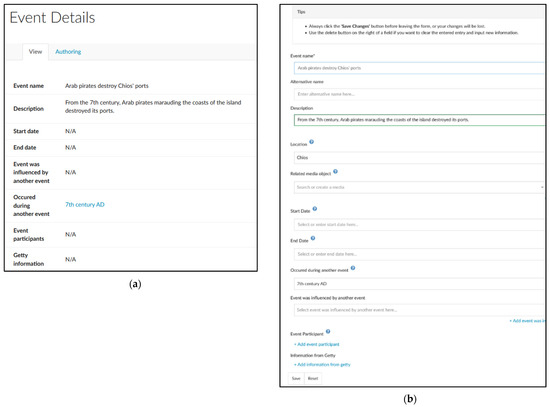 Events are the building stones of narratives. For their data curation requested, information includes name, alternative name, description, related media objects, etc. (Figure 7a,b). Crucial to their representation is the definition of event participants (persons) and their role. Furthermore, the definition of relations between events is supported through the properties “was influenced by another event” and “Occurred during another event”. A narrative can be considered a way of presenting a collection of events. Such a collection is defined as a fabula. Nevertheless, the fabula can be extended while formulating a narrative through complementary events. A fabula is authored by a title, description, and the association of events (Figure 7c). Previewing fabula results in a page where several details are extracted through the associated events, such as the locations where the events took place (Figure 7d).