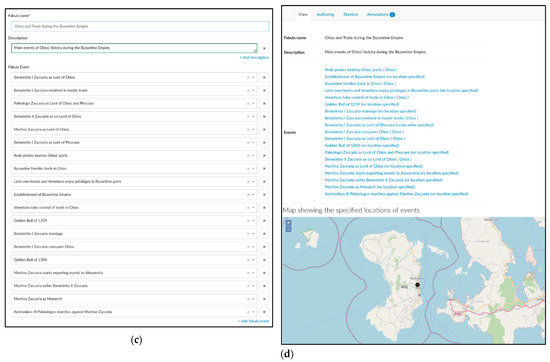 Fabula authoring—“Chios and Trade during the Byzantine Empire”. (a) Event page, (b) Event authoring form, (c) Fabula authoring form, (d) Fabula page.