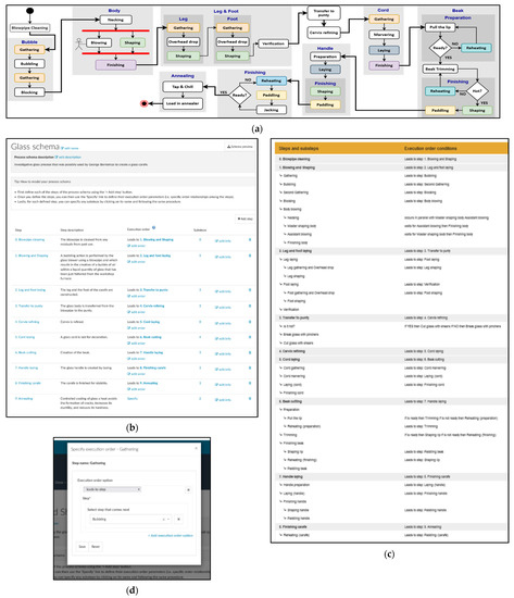 Process Schemas can be considered as the conceptualization of an activity diagram that is authored based on the understanding of the crafting process. An example of such a diagram for the creation of a glass carafe is shown in Figure 8a.