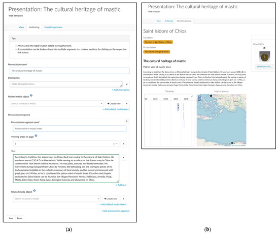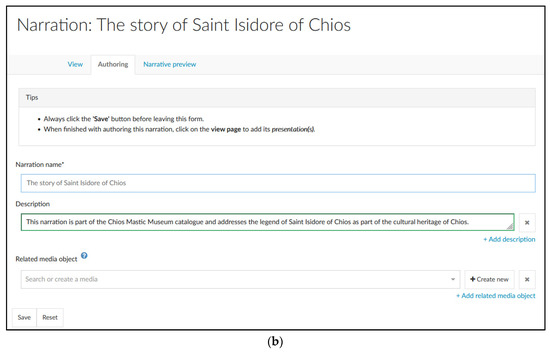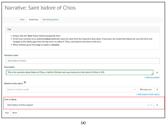After creating the fabula, the data curator can author a narrative and link a set of narrations that present the narrative of the corresponding fabula. On the narrative authoring form (see Figure 9a), the data curator can provide additional information, including a description, linked media objects, and the fabula of the narrative. We have selected the “Saint Isidore of Chios Legend” fabula from the drop-down menu in this example to create the “Saint Isidore of Chios” narrative (Figure 9a).