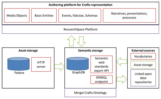 In this work, we present an online platform that was developed in the context of the Mingei project. Mingei (http://www.mingei-project.eu/, accessed on 20 March 2022) is an Innovation Action in the Horizon 2020 Programme of the EC that proposes the digital and semantic representation of heritage crafts (HCs) [5] and motivates their preservation by supporting pertinent experiential and educational applications in the domain of cultural and thematic tourism. The Mingei Online platform (MOP) [6] facilitates the representation of the socio-historic context through narratives. The purpose is to: (1) document, represent, and preserve intangible dimensions along with objects and sites, (2) contextualize the presentation of tangible heritage, (3) systematize and facilitate the presentation of socio-historical context, and (4) document traditional crafting processes. MOP provides facilities for exporting knowledge in various formats to support continuous re-use and sharing of information, including direct open access to documented knowledge. Furthermore, it enhances the documented information by establishing a linkage between MOP and other relevant publicly available knowledge bases such as Europeana [7], Europeana-based repositories [8,9], and repositories based on Arches [10,11].