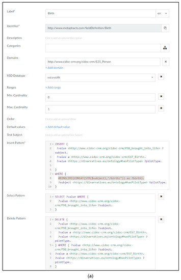 - Tudhope, D.; Binding, C.; May, K.; Charno, M. Pattern based mapping and extraction via CIDOC CRM. In Proceedings of the Workshop Practical Experiences with CIDOC CRM and Its Extensions (CRMEX 2013), 17th International Conference on Theory and Practice of Digital Libraries (TPDL 2013), Valetta, Malta, 26 September 2013; Volume 26, pp. 23–36. [Google Scholar]
