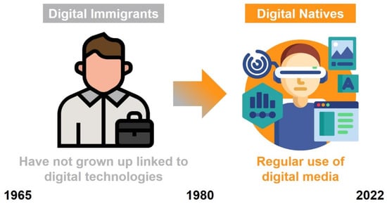 Numerous studies show that the digital generation is a strongly influential variable in digital competence or in the perception, or frequency of use, of digital resources among professors [44,45]. According to Prensky’s theory [46,47], two main generations can be distinguished, in terms of degree of connection with digital technologies (Figure 1): (i) digital natives and (ii) digital immigrants. Digital natives are those who were born and raised in a digitalized environment, so that computational media are routine for them, as if they were their mother tongue, in Prensky’s terms [46]. Digital immigrants, on the other hand, have not grown up linked to digital technologies, but have been incorporated into them, so that they have learned them, as one learns a second language. Prensky identifies a chronological distinction between the two generations, so that those born before 1980 would be digital immigrants and those born after 1980 are digital natives. There may be sociological and cultural aspects that condition the digital generation of individuals beyond the year of birth. For example, a person born after 1980 could be considered a digital immigrant if, having grown up in a depressed or rural area, in terms of access to technological resources, he or she was deprived of the regular use of digital media during his or her youth. However, many studies consider 1980 to be the objective chronological boundary between digital immigrants and digital natives [48,49,50,51,52,53].