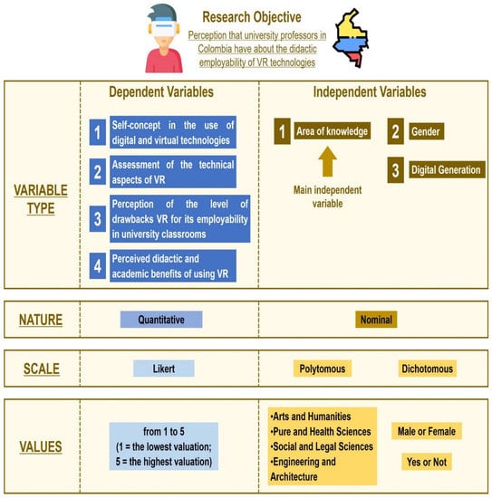 The general objective of this research was to study the perception that university professors in Colombia have about the didactic employability of VR technologies and the differences that exist, with respect to this perception, according to the professors’ areas of knowledge. In particular, the following specific objectives were pursued: (i) to analyze the perception of Colombian university professors about their digital competence and their assessment of VR from technical and didactic points of view and of the disadvantages of its use; (ii) to identify gaps in the above perceptions by reason of the professors’ area of knowledge; and (iii) to study the influence of the professors’ gender, and their digital generation, on their perception of the didactic employability of VR technologies.