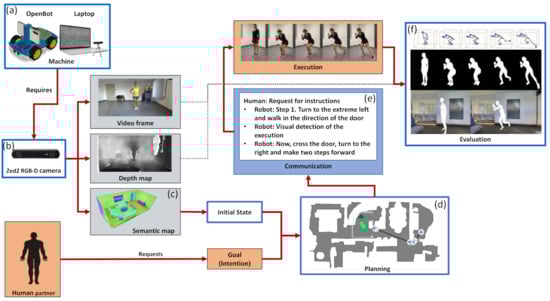 The Spatial Task Framework (STF) framework. Machine modules: (a) laptop, 3D-printed OpenBot robot [30], (b) Zed2 stereo or Kinect Azure ToF camera mounted on the robot base, (c) Simulation tool: Replica environments in Habitat platform [28], (d) a SLAM module for navigation planning, (e) a communication module for machine help in navigation, and (f) different body pose estimation methods, including an avatar for position optimization, body motion detection and evaluation (see Figure 2 for details).