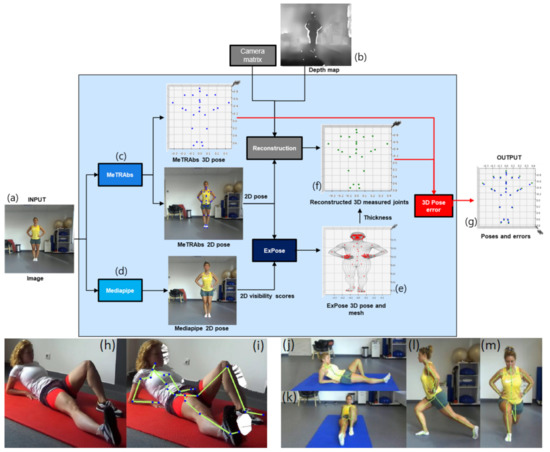 - We present results for the following components: absolute 3D human pose skeleton estimation using (i) MeTRAbs [21] and (ii) MediaPipe [22], (iii) ExPose [20] that directly regresses the body, face, and hands, in SMPL-X format for the estimation of body shape, (iv) the point cloud of the Zed2 or Kinect Azure camera to derive ground truth values, and (v) a perspective distortion compensation module for the case if the camera and the body are too close to each other.