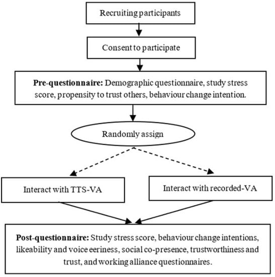 As illustrated in Figure 2, following consent, participants received a demographic questionnaire, propensity questions from the trustworthiness questionnaire, and behavior change intentions questionnaire. They were asked to score their emotional feelings towards their studies on a score of zero (extremely relaxed) to ten (extremely stressed) and to confirm that the computer sound was on, in order to listen and interact with the VA. Participants were randomly assigned to interact with VA-recorded or VA-TTS.