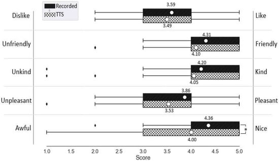 To evaluate the participants’ impression of the VA, we used the likeability scale questions from the GodSpeed questionnaire introduced by Bartneck et al. []. The reliability test for the items using Cronbach α was 0.862. Ho and MacDorman [] suggested adding another scale to evaluate the perception of the agent’s voice independently from the perceived humanness of the agent, and they called it eeriness.