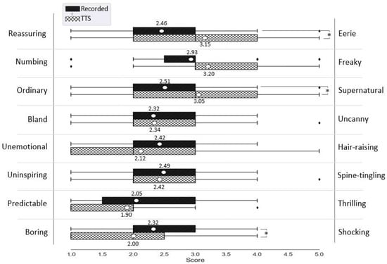 Figure 4 presents the VAs’ voice impression. Independent-samples t-test revealed statistically significant between-group differences in three items out of the eight items of the questionnaire. Compared to the VA-recorded, participants found VA-TTS eerier (), more supernatural (), and more boring (). However, t-test reported no statistically significant difference between the voice impression as a construct of IVA-recorded and IVA-TTS ().
