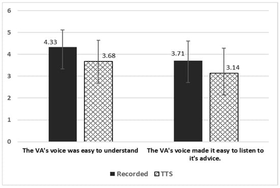 Regarding the understandability of the voice (Figure 5), participants evaluated the VA-recorded significantly easier to understand (), and significantly easier to listen to its advice ().