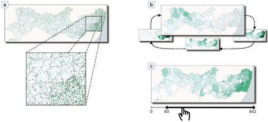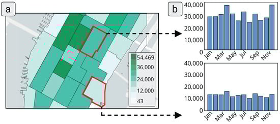 Figure 2 presents the mean number of monthly taxi trips in Manhattan for a period of one year. While the aggregated map only shows a statistical summary (e.g., mean, sum) (a), there is an underlying monthly distribution of the number of trips over the entire year (b).