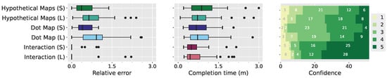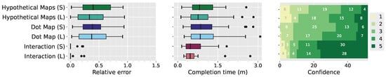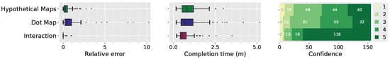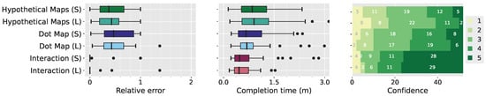 justified confidence. This can be explained by the fact that the interaction allows for the exact quantification of the probability distribution, while dot map and hypothetical maps rely on counting or memorization of partial results. As pointed out by the participants, this creates a level of insecurity when answering the questions. Both HOM and DDM had large relative errors, especially for the retrieve value task, with medians larger than 0.25. Errors of this size are likely not to be suitable for real applications. The quantitative results support our initial hypotheses H1, H2, and H3.