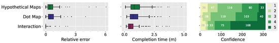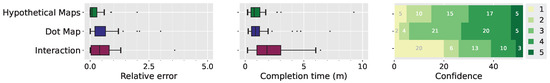 Figure 8). This behavior is also similar among participants in the HOM group. In both cases, the difference between the variables was statistically significant according to the MWW test. The distance between areas did not impact the relative error in the DIM technique; both conditions had a small error, with a median of 0. The user study did not show any significant impact in terms of completion time or confidence in all three techniques.