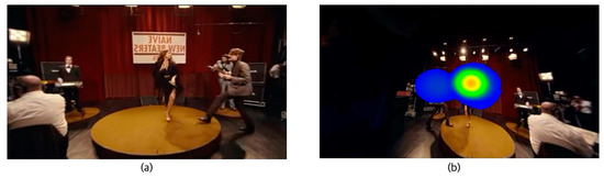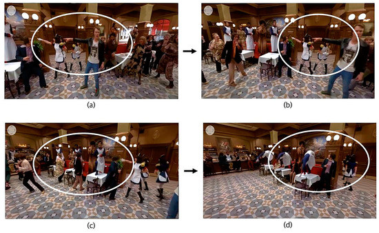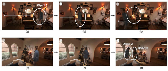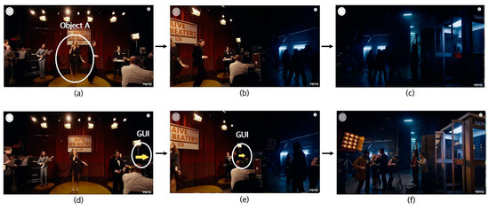 Analyzing video no. 28 [51], object A moves to the left in the direction of the arrow as shown in Figure 2a–c. When users move their attention to the left along with object A, they can see scenes, such as Figure 2d,e, and end up watching scenes where objects A and B have a conversation with each other, as shown in Figure 2f in the position intended by the director.
