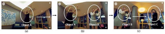 Analyzing video no. 6 [29], the marked object A in Figure 4a is beckoning in the direction of the arrow, and when users move their attention to the right, which is the direction in which object A beckons, object B in Figure 4b can also be seen to be beckoning to the right. When users move their attention in the direction in which object B beckons, users can see the scene where object C, the main character, is dancing in the position intended by the director as shown in Figure 4c.
