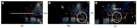 Gaze angle variation is a directing technique that induces a user’s attention by adjusting the range of gaze angles that users can see. It is used when the users’ attention needs to be focused by reducing the area of the screen that users can see to narrow the gaze angle of users, or when users must move their attention to the position intended by the director by widening the area of the screen to expand the angle of user gaze. The gaze angle variation technique is shown in 2 videos out of the 35 music videos analyzed. For example, when analyzing video No. 10 [33], as seen in the marked area shown in Figure 8a, the space except object A is darkened so that the screen area is reduced and the gaze angle of users is narrowed; therefore, the users’ attention is focused on object A. As the video is played, the screen area is broadened, as shown in Figure 8b, so that the visual angle of the user widens from the center, where object A is positioned, to the direction of the arrow. At this time, users see the scene in which the entire space intended by the director enters the user’s view, as shown in Figure 8c.