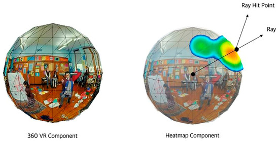 As shown in Figure 9, the 360-degree VR eye-tracking system consists of a 360-degree VR component, which plays 360-degree VR videos, a heatmap component that visualizes the heatmap and records users’ eye-tracking results, and a 360-degree VR heatmap manager component that manages visualized heatmap texture based on an eye-tracking component. The heatmap component with the mesh collider generates a ray hit point in the position, where the ray and mesh collider collide, which is generated in the user’s gaze direction. Concurrently, a heatmap texture was created as an alpha value from the position where the ray hit point was generated, and it was designed to overlap and record videos played on a 360-degree VR component. Overlapped and recorded 360-degree VR videos and heatmap textures were recorded and stored using a camera in the heatmap component. As shown in Figure 10a, as users watch 360-degree VR videos, the result of the users’ eye-tracking is recorded, as shown in Figure 10b.
