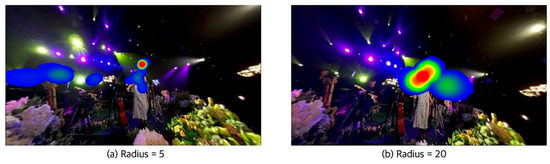 The eye-tracking system proposed in this paper is based on the heatmap. Heatmap is a data visualization technique that shows the magnitude of a phenomenon as color in two dimensions. Additionally, the eye-tracking system used in this paper is for 360-degree VR video. The radius, weight, and duration functions are designed to adjust the visual function of heatmap to fit the frame and size of the video to be used in the experiment. The values of radius (5, 20), weight (5, 20), and duration (2, 20) were set to account for the change when the value of the variable was changed. After measuring with various values, it was set to a value that can clearly show the change.