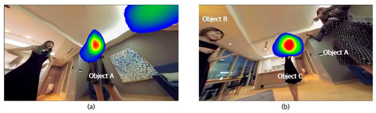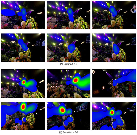 Under the same conditions in which the same section was cut into frames per second and listed in order, Figure 13a has a duration value of 2, and in Figure 13b, the applied duration value is 20, and then the result of eye tracking is compared and analyzed. As such, duration is a duration value of heatmap per second when the users move their gaze, which is the time when the heatmap remains where the gaze has originally reached. As the duration value of the heatmap increases, the heatmap remains longer when the user’s gaze is reached.