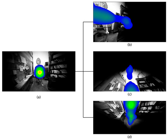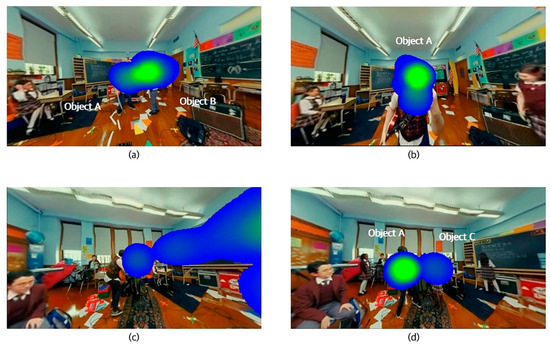The data in the gaze angle variation experiment turned out to be 72.3% (34 subjects). An analysis of the experiment results shows that, as shown in Figure 20a at the beginning of the video, most subjects’ attention is fixed on object A, which is positioned in the center, because the gaze angle that the subjects can see is relatively narrow. As the video is played, the gaze angle becomes wider, as shown in Figure 20b–d, and when the subject’s attention moves along with the edge of the widening gaze angle, it can be said that the attention moves along with the attention-attracting element of gaze angle variation.