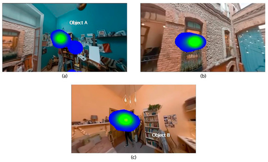 The data in the camera movement experiment were 91.5% (43 subjects). An analysis of the experimental results shows that, as shown in Figure 19a, the subject’s attention is focused on object A before the camera moves. As the video is played, the camera starts to move, and the subject’s attention moves from object A to the space visible, as shown in Figure 19b, and then the attention moves to object B, as shown in Figure 19c. It moves along with the attention-attracting element of the camera movement.