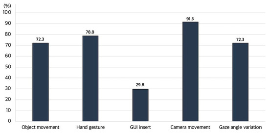 This paper proposed the necessity of discovering directing techniques that can attract users’ attention in 360-degree VR video and analyzed 360-degree VR music videos to classify the attention-attracting elements into object movement, hand gesture, GUI insert, camera movement, and gaze angle variation. An eye-tracking system in a VR environment was developed, and related experiments were conducted to analyze whether the derived attention-attracting elements attract users’ attention in 360-degree VR videos. Based on the results obtained from tracking the subjects’ gaze, each attention-attracting element is summarized in Figure 21. As shown in Figure 21, the horizontal axis of the graph represents five attention-attracting elements, the longitudinal axis represents effective data, and the data determined to be effective in each attention-attracting experiment were the following: object movement—34 subjects (72.3%), hand gesture—37 subjects (78.8%), GUI insert—14 subjects (29.8%), camera movement—43 subjects (91.5%), and gaze angle variation—34 subjects (72.3%).