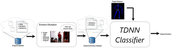 To this end, as a side-step of this work, we designed an emotion elicitation study starting from a well-known gestural dataset of Italian illustrator gestures. Such a dataset was built in the “Chalearn 2013 competition”, described in [18]. The download is available at http://sunai.uoc.edu/chalearn/ accessed on 13 July 2022.